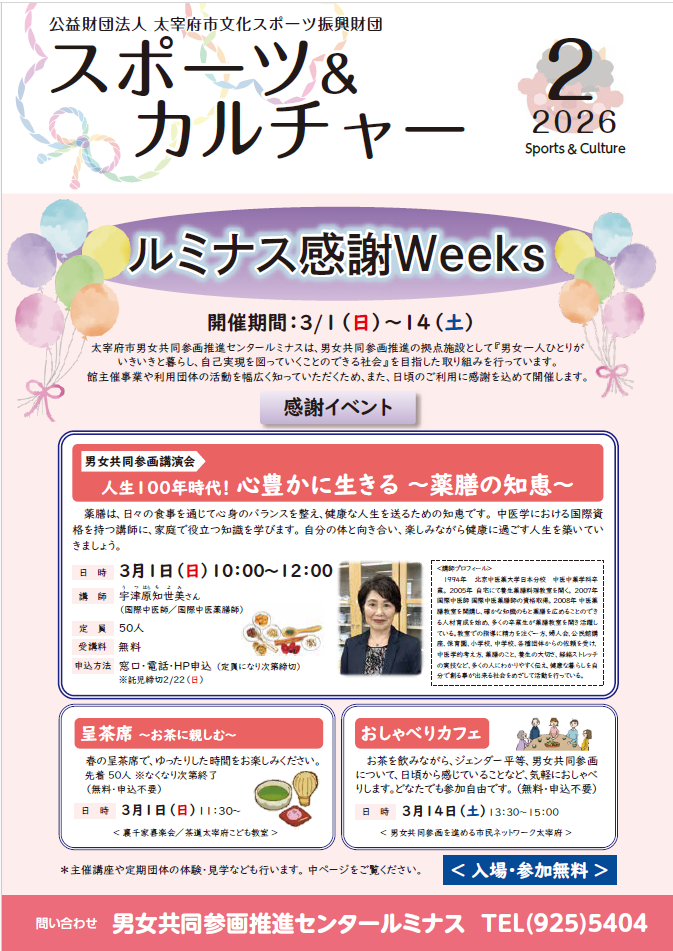 23 1月 スポーツ&カルチャー 2026年2月号 毎月1日発行「スポーツ&カルチャー」の最新号 令和8年2月号が発行されました! 今月の見どころは!? ルミナス感謝Weeks 「男女共同参画推進センタールミナス」の感謝イベント イベントの詳しい内容はスポカル2月号の画像をクリック! 太宰府市の文化・スポーツ情報満載の スポーツ&カルチャー2月号 是非ご一読ください。 (画像をクリックすると、PDFファイルにてご覧になれます) Post Author: dazaifu-z-cms
