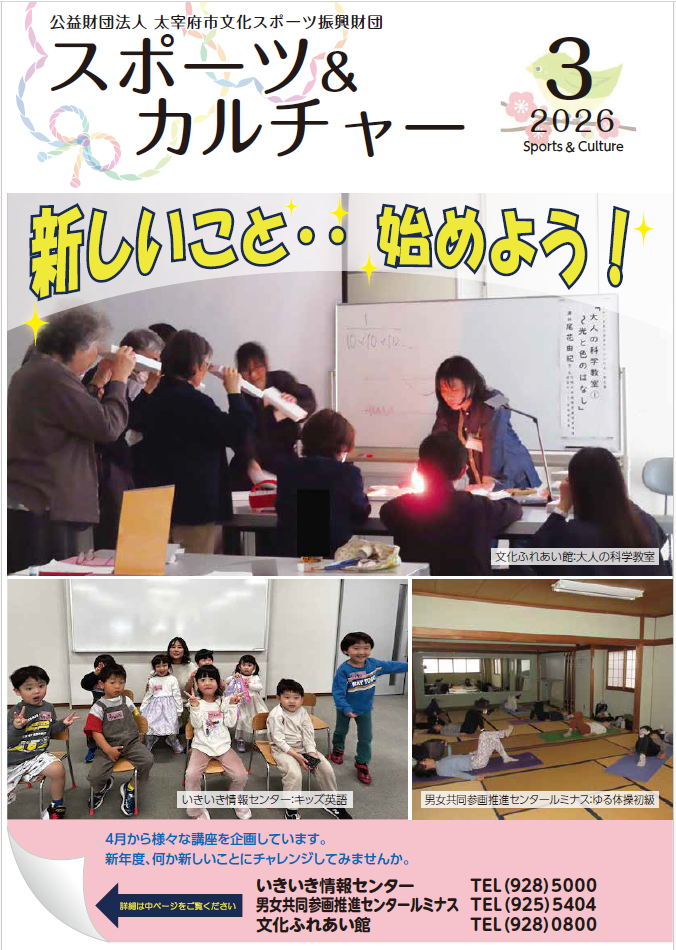 20 2月 スポーツ&カルチャー 2026年3月号 毎月1日発行「スポーツ&カルチャー」の最新号 令和8年3月号が発行されました! 今月の見どころは!? 「新しいこと・・始めよう!」 新年度からスタートする各施設の講座情報満載です!! 春から新しいこと始めませんか?文化・芸術・スポーツの情報の中から 自分にぴったりの情報がきっと見つかる! 講座募集情報が満載です! 太宰府市の文化・スポーツ情報満載の スポーツ&カルチャー3月号 是非ご一読ください。 (画像をクリックすると、PDFファイルにてご覧になれます) Post Author: dazaifu-z-cms