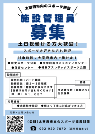 (公財)太宰府市文化スポーツ振興財団で一緒に働いていただける方を募集しています。 勤務を希望する人は、登録が必要になります。お気軽にお問い合わせください。 ↑クリックすると別ウィンドウで画像が拡大表示されます。 &nbs […]